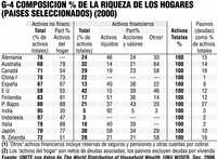 6) Per cápita (toda la población) la riqueza en Estados Unidos promedió 144 mil dólares y 181 mil en Japón; en México fue de 13 mil dólares, en China de 2 mil 600, y en la India de 1 mil 100 (Gráfico 2)