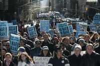 Líderes sindicales, religiosos y del movimiento antiguerra llevaron la fila de unos dos mil a cuatro mil manifestantes por la Calle 42, cruzando el corazón de la ciudad al pasar por la Quinta Avenida.