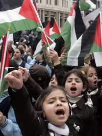 Escolares de Nablus ondean banderas en apoyo al gobierno integrado por Hamas, Fatah e independientes