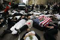 Más de 40 personas fueron arrestadas por simular ser víctimas de la violencia en Irak y bloquear la entrada de la Bolsa de Valores en Nueva York