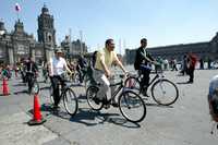 La representante de Comunicacion Social del DF, Dinora Pizano; el secretario de Desarrollo Social, Martí Batres; la directora del Inmujer-DF, Malú Mícher (al fondo), y el director del Instituto de la Juventud, Javier Hidalgo, durante un paseo en bicicleta por el Zócalo