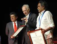 Oaxaca, Oax., 21 de marzo. Con un largo aplauso como fondo, el rector de la Universidad Autónoma Benito Juárez de Oaxaca (UABJO), Francisco Martínez Neri, entregó hoy al pintor Francisco Toledo y al escritor Sergio Pitol sendos doctorados honoris causa conferidos por el Honorable Consejo Universitario.