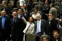 La diputación panista celebra en el salón de plenos de San Lázaro, luego de la aprobación de los cambios al sistema de pensiones de los servidores públicos