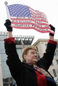 Participante en un mitin de apoyo a las autoridades de la ciudad de Hazelton, Pensilvania, quienes enfrentan un proceso a causa de su política migratoria. Hazelton fue la primera ciudad de Estados Unidos en adoptar ordenanzas municipales que penalizan a las empresas que contraten indocumentados y a quienes les alquilan viviendas. La imagen fue captada el lunes pasado. La leyenda en la bandera dice: "Los indocumentados cuestan 10 mil millones de dólares a Estados Unidos. Cada inmigrante cuesta 89 mil dólares a los contribuyentes"