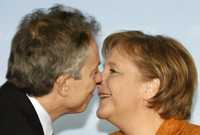 La canciller alemana, Angela Merkel y el primer ministro británico, Tony Blair, a su llegada. ayer, al Museo Histórico de Berlín