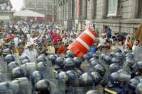 Siindicalistas opositores a las reformas a la Ley del ISSSTE intentaron llegar a la Cámara de Senadores, pero fueron repelidos por granaderos en la plaza Tolsá
