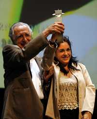 Vicente Leñero con su hija Mariana, a quien de regalo de cumpleaños le entregó el galardón