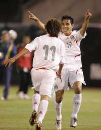 Omar Bravo (derecha) y Andrés Guardado festejan la anotación del delantero del Guadalajara en el encuentro ante el conjunto sudamericano