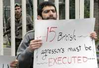 Un estudiante se manifestó ayer frente al Ministerio del Exterior en Teherán para pedir la ejecución de los 15 soldados británicos capturados por el gobierno iraní