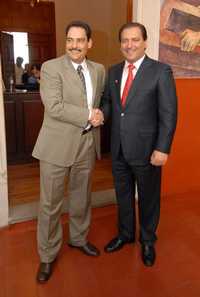 El gobernador de Aguascalientes, Luis Armando Reynoso Femat, estrecha la mano del dirigente estatal del Partido Acción Nacional (PAN), Antonio Martín del Campo, luego de casi dos años de enfrentamiento abierto entre el grupo afín al mandatario y el que apoya al líder partidista, conocido como los institucionales