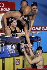 Sin embargo, había más por Estados Unidos, ya que Natalie Coughlin, Dana Vollmer, Lacey Nymeyer y Katie Hoff, integrantes del relevo femenil 4x200 libre, establecieron nuevo récord mundial en la prueba, al detener el cronómetro en 7:50.09 minutos, con lo que se colgaron la presea áurea.