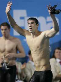 Michael Phelps celebra su tercera marca del orbe en el campeonato australiano, ahora en 200 metros combinados
