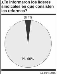 Los líderes de la burocracia no consultaron con las bases el contenido de la nueva Ley del ISSSTE, que esta semana terminó de aprobarse en el Senado después que fue autorizada por la Cámara de Diputados. En un sondeo que hicimos entre empleados públicos, 96 por ciento contestó que no se le preguntó su opinión y 84 por ciento está convencido de que la nueva legislación los hará más pobres.