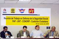 Los grupos parlamentarios de PRD, PT y Convergencia, además de varias organizaciones sindicales, como la Unión Nacional Trabajadores (UNT), acordaron luchar conjuntamente para echar abajo la reforma a la Ley del ISSSTE y hacer frente a la "embestida" del gobierno de Felipe Calderón contra las conquistas laborales.