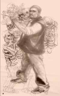 Como contraparte y complemento de la exquisita obra dibujística, las pinturas revelan una intención de síntesis formal, a través de la cual el artista se ha desprendido poco a poco de la figuración para plasmar sus metáforas sensuales. La escultura No dos representa la unión de los opuestos, el ying y el yang, la vida y la muerte, tallados en un enorme tronco de ahuehuete dividido por la mitad, cuya sección derecha es la imagen vital de un Buda en estado de concentración, mientras que el lado izquierdo revela una impactante muerte descarnada.