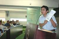 El diputado panista Mario Pacheco Ceballos muestra el documento firmado por 10 de los 13 legisladiores locales de su partido, en el cual rechazan su remoción como coordinador parlamentario del PAN y denuncian la imposición de Yolanda Montalvo López