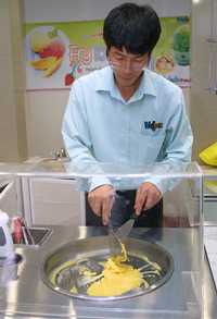 "El concepto surgió el año pasado en Corea. La idea es ofrecer algo ciento por ciento natural preparado al instante, higiénico y de calidad. Primero se prepara la base del helado, al cual se le agrega agua; después se le añade fruta -toda la que se desee. Todo eso, sobre una charola y se manipula. El proceso tarda entre 30 y 40 segundos.