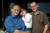Faye Turney, la única mujer del grupo de 15 marinos detenidos en Irán y liberados el pasado miércoles, con su esposo, Adam, y su hija, Molly, ayer en la base militar de Chivenor