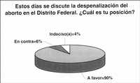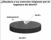 Una mayoría clara, rotunda -90 por ciento-, dijo sí a la despenalización del aborto, que en estos días se discute en el Distrito Federal, en nuestra encuesta de esta semana. Seis por ciento se manifestó en contra, y el cuatro por ciento restante está indeciso. Hicimos una segunda pregunta: ¿ofendería a tus creencias religiosas la legalización del aborto? Noventa y dos por ciento contestó que no, seis por ciento dijo que sí y el otro dos por ciento se mostró indeciso.