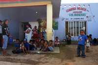 Hijos enfermos de jornaleros descansan en la guardería de uno de los conjuntos de galeras en el municipio de Huetamo, Michoacán