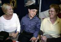 Arthur Batchelor, de 20 años de edad, el más joven de los 15 militares liberados por las autoridades iraníes, bromea rodeado por parientes frente a los medios de comunicación después de una rueda de prensa en los cuarteles de los marinos reales en Chivenor, Devon, sudoeste de Inglaterra.