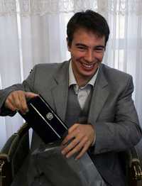 Felix Carman, teniente de la marina real, ríe mientras sostiene un regalo del gobierno de Mahmud Ahmadinejad poco antes de abandonar Irán, el pasado jueves en el aeropuerto internacional de Mehrabad, Teherán; un día después, en Gran Bretaña, el uniformado cambió sus elogios a Irán por diatribas