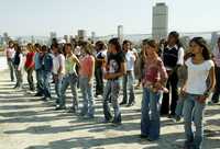 Las 70 quinceañeras que apadrinará el Gobierno del Distrito Federal ensayan el vals en la azotea del edificio sede del Instituto de la Juventud, cerca del Colegio Militar