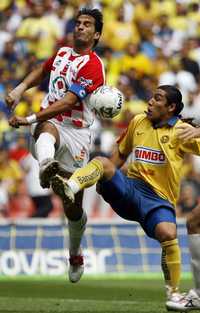 Juan Carlos Leaño, de Tecos, y el americanista Salvador Cabañas disputan el esférico