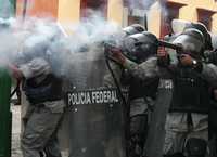 Agentes de la Policía Federal Preventiva lanzan gases lacrimógenos contra integrantes de la Asamblea Popular de los Pueblos de Oaxaca durante el enfrentamiento ocurrido el pasado 20 de noviembre