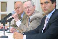 Oscar Kaufmann, vocero de Industrial Minera México, y los abogados Salvador Rocha Díaz y Alberto Zinser, en la conferencia de prensa