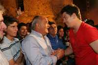 El candidato panista a la gubernatura de Yucatán, Xavier Abreu Sierra, saluda al cantante Yahir durante un acto de campaña en Mérida, el viernes pasado