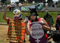 La aproximadamente media centena de jóvenes enmascarados, en su mayoría mujeres, quienes viajaban en dos camiones con plataforma y una camioneta, dieron tres vueltas por el monumento gritando consignas como "Aborto sí, aborto no, esa decisión la tomo yo", sin que se registrara ningún incidente entre ambos grupos de manifestantes.