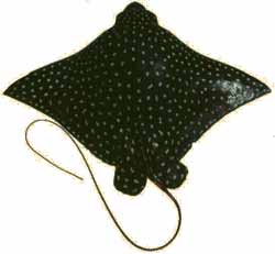 Arriba, vista dorsal de la raya tecolote; enmedio, raya látigo