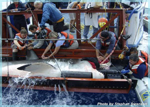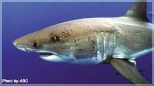 De pronto, recibimos una llamada por radio del barco de avistamiento de tiburón y nos dirigimos hacia ellos. Al llegar, tiramos toda la carnada otra vez y lo buscamos. Estaba observando cuando oí gritos de: "Ahí está, se les acerca" Miré hacia la carnada y ¡guau!, observé mi primera aleta de tiburón, la aleta dorsal, la parte superior de la cola y una parte de su cuerpo Se veía de color negro. Dijeron que era como de tres metros de longitud. Yo lo vi más grande Al día siguiente, cortando unos pedazos de pescado para ponerlos como carnada y arrojando los pedazos pequeños que sobraban al mar, me puse a ver las macarelas que se juntaban en torno a esos desperdicios, cuando ¡vi pasar un gran tiburón blanco! Nos preparamos para seguirlo, subimos a la lancha y tiramos la carnada. Después de un rato, vimos uno cerca de la panga, grande (como de 4.5 metros de longitud), majestuosa, pues después supe que era "ella". Mordió el anzuelo, pero lo dobló. Se usaron otros anzuelos y capturamos otra, y los dobló otra vez. Y en el tercer intento, ya reforzados los anzuelos, los volvió a doblar, rompiendo incluso uno de ellos... Y no hubo más, no pudimos capturar ninguno Fue un día de mucha actividad y de mucha expectativa, pero principalmente de mucha emoción. Vi mínimo tres diferentes tiburones, dos grandes y uno "chico" (3.5 a 4 metros), los vi acercarse a la carnada junto al bote, vi todo el cuerpo, vi los dientes de uno bajo el agua. Otro sacó la cabeza varias veces. Pude también ver cómo circundaban la panga, cómo se abalanzaban contra el anzuelo, uno viniendo hacia mí mientras yo jalaba la carnada, sacudiéndose al sentir el jalón del anzuelo Fue una experiencia irrepetible, emocionante, ¡fantástica! Nos levantamos temprano el 16 y bien pronto ya estábamos en la panga. Nos alejamos del barco y comenzamos a poner la carnada Mientras observábamos, en unos pocos segundos de distracción, se sintió un jalón en la cuerda que sostenía la carnada. En seguida nos pusimos en posición de respuesta. Increíblemente, era la misma que apenas un día antes había doblado dos veces los ganchos. Después de tres intentos, mordió la carnada y, al fin, la teníamos. Comenzamos a jalarla hacia el barco, pero estaba peleando mucho , era enorme. Después supe que de casi cinco metros de largo. Y comenzó el jaloneo. Cansado, pero emocionante. La remolcamos durante 40 minutos para que se cansara. Jalando, soltando cuerda, jalando otra vez un trabajo pesado de verdad. Les pasamos la cuerda principal a los del barco y nos quedamos con la segunda cuerda. Y fueron como seis intentos para tratar de meterla a la jaula porque se iba por debajo de ella y entonces teníamos que jalar nosotros.