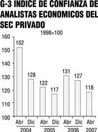 Con las respuestas anteriores y otras, el Banco de México elabora el Indice de Confianza de los analistas del sector privado que tiene como año base 1998=100. En este abril dicho índice se ubicó en 118 puntos, abajo de abril de 2006 (131), de abril de 2005 (122) y de abril de 2004 (152 puntos) (Gráfico 3).