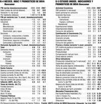 Pronósticos del BBVAEn su revista Situación, correspondiente al primer trimestre de este año, BBVA Bancomer publica sus indicadores y pronósticos más recientes para la economía de México en 2007, mismos que reproducimos en el (Gráfico 4). Asímismo, por considerarlo de interés, se reproducen los indicadores y pronósticos de este banco relativos a la economía de Estados Unidos os cuales reproducimos en el (Gráfico 5).