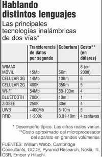 Más cerca de casa, y con señales de dos vías, están las tecnologías de telefonía celular de cobertura amplia como GSM y CDMA. Entre las versiones avanzadas de "tercera generación" (3G) destacan HSDPA y LTE, desarrolladas por la industria de los celulares. Un contendiente prometedor es WiMax, tecnología basada en los estándares de Internet con respaldo de la industria informática. Una tercera categoría incluye señales de menor alcance utilizadas para conectar dispositivos dentro de una habitación o un edificio, como los sistemas Wi-Fi para conectarse a Internet dentro de hoteles o aeropuertos, o Zigbee, protocolo de comunicaciones inalámbricas que sirve para interconectar sensores. Un avance reciente es la tecnología de banda ultra ancha (UWB), que utiliza frecuencias sumamente altas de cobertura muy limitada para transmitir grandes volúmenes de información, por ejemplo, para enviar un video desde un IPod o un dispositivo similar a un televisor.