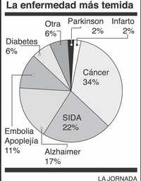 En una encuesta que abarcó a 8 mil 679 personas de ambos sexos y diferentes edades de toda la República, con el tema "¿cuál es la enfermedad que más temerías que te diagnosticaran?", 35 por ciento contestó que el cáncer; 22, el sida; 17, el Alzheimer; 11, embolia/apoplejía; cinco, la diabetes; dos, el mal de Parkinson, y otro dos por ciento, el infarto.
