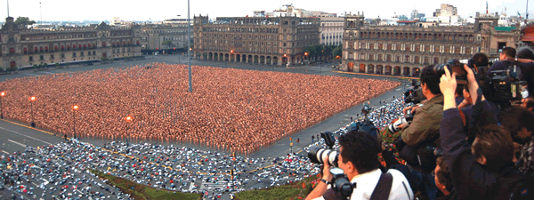 No faltaron aquellos, muy expertos en arte, que creyeron que lo importante de las fotos de Tunick eran las fotos de Tunick. En su preocupación porque se supiera que no consideraban arte el trabajo del conocido fotógrafo, llegaron a calificar a la masa de modelos como carnes Bachoco y al fenómeno como un acontecimiento de cultura Walmart. También se habló mucho de la desafortunada separación de modelos por su sexo y los problemas logísticos y contradicciones de lo discursivamente correcto que se suscitaron por ello. Nada de eso borra lo interesante de la gran travesura que fuimos capaces de llevar a cabo aquella memorable mañana de mayo. Aunque algunos asistentes ya eran consumados nudistas, lo interesante es que la simple ausencia de ropa causara en la multitud la euforia que no causa un baño público o un espacio nudista nacional o extranjero. Era verdaderamente infantil; en el mejor de los sentidos. No éramos pollos Bachoco, ni niños Walmart o Green Corner. Éramos muchísimos escuincles embelesados con lo que estábamos haciendo. No importaba si estábamos panzones o nalgones o chichones o peludos o cebosos o pedorros o llenos de barros. Estábamos sencillamente encantados, al saludar a la bandera ausente, al mirar el cielo azul o nuestro prójimo, mientras se nos clavaban piedritas en la espalda o en las rodillas, mientras escuchábamos y contemplábamos a tanto cómplice sorprendido y seducido por un México menos teórico y más preciso.