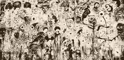 El artista Sergio Hernández fue invitado por Isaac Masri hace unos meses a realizar una gran exhibición individual en este magnífico recinto recién adaptado como museo, que fue hacia principios del siglo pasado una planta generadora de energía para tranvías. Hernández decidió preparar una exposición en torno al conflicto social que vivió en carne propia en su ciudad. Paralelo a la creación de una serie de pinturas, esculturas y obra gráfica, Sergio invitó a tres pintores a realizar dos obras al alimón, a manera de un melting pot en el que se concatenan una serie de imágenes estrujantes que trasminan el humor ácido y negro con el que plasmaron su coraje, zozobra y desazón. Demián Flores, Guillermo Olguín, Dr. Lakra y el propio Hernández plasmaron en dos grandes telas (245x708 y 300x540) imágenes esperpénticas que aluden al gobernador Ulises Ruiz, rodeado de toda suerte de sabandijas y monstruos diabólicos que parecen extraídos del más puro realismo grotesco que describía el notable teórico ruso Mikjail Bajtin, gran estudioso de Rabelais. También convocado por Hernández, el espléndido fotógrafo Antonio Turok, autor de portentosas imágenes de las guerrillas y levantamientos sociales en Latinoamérica, presenta impactantes fotografías captadas en las calles durante los enfrentamientos con la pfp, entre ellas, el retrato del fotógrafo Bradley Hill recién asesinado. Se muestra también una imagen de las barricadas ampliada a gran formato e intervenida por Hernández con grana cochinilla aplicada a manera de chorreados que evocan la sangre derramada. En sus pinturas recientes, Sergio abstrae los elementos figurativos y los reemplaza por líneas caligráficas, manchones y escurrimientos que simbolizan los alambres de púas de las barricadas, la sangre desparramada y los disparos de las armas de fuego. Dentro de la obra gráfica destaca Picasso en El sueño de uro, una irónica reinterpretación de Sueños y mentiras de Franco, así como ecos de José Clemente Orozco en Las masas, y de Goya en Los chimuelos.
