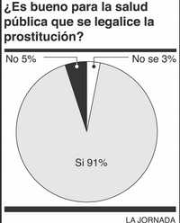 Un grupo de legisladores perredistas ha planteado a la Asamblea Legislativa del Distrito Federal una iniciativa para que se legalice la prostitución. Esta semana, nuestro sondeo se ocupó del tema: ¿Es bueno para la salud pública que se legalice? El 91 por ciento contestó que sí, 5 por ciento emitió una opinión contraria y 4 por ciento dijo 'no sé'. ¿Sólo debe legalizarse la prostitución femenina, o también la masculina? El 95 por ciento contestó que ambas y 5 por ciento respondió que sólo la femenina.