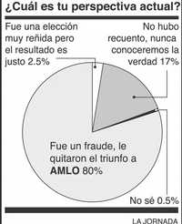 El sondeo de esta semana -Aquel 2 de julio- prendió a los miembros del Foro México: participó 42 por ciento, una marca sin precedente. Sólo hubo una pregunta: ¿cuál es tu perspectiva actual de la elección presidencial? Ochenta por ciento piensa que "fue un fraude, le quitaron el triunfo a AMLO"; 17 por ciento opina "que no hubo recuento de votos, nunca conoceremos la verdad", y 3 por ciento sostiene que "fue una elección muy reñida, pero el resultado es justo".