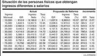 Así, por ejemplo, de ser aprobada la propuesta calderonista, las personas que reciban ingresos diferentes a salarios, y que perciben por ejemplo 20 mil pesos mensuales de ingresos tengan un incremento en su carga fiscal hasta de 2.72 por ciento, lo que equivale a pagar 544 pesos más de lo que pagan en la actualidad, o bien una persona que recibe 35 mil pesos mensuales pagará 848 pesos más de lo que paga ahora.