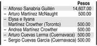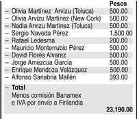 Aparte de la lista del ingeniero Martínez McNaught, el doctor Del Río recibió en forma directa los donativos de las siguientes personas: Jorge Mejía, Alejandro P., Alejandro Domínguez, Guillermo de la Cruz Issa, Catalino Macedo Vences, Francisco de la O, Marcos García, y José M. Alvarez Mota. En total: mil 843 euros. Con esta suma, podrá permanecer en Finlandia hasta septiembre cuando termina su tarea y pagar su boleto de vuelta a Michoacán.