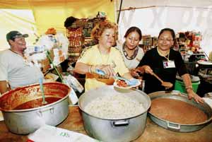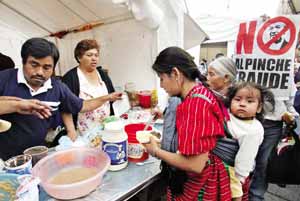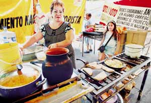 La solidaridad es la reina de la fiesta. Hace una hora, mientras íbamos hacia el templete, una mujer que sólo vería yo en las manifestaciones me tendió una camiseta. Otra, una mascada; otra, un monedero que ahora mismo traigo en la bolsa. "Allá están regalando tortas de mole." "¿Cómo que regalando?" "Sí, regalando." En el Zócalo, dar es natural. Tortillas, tacos, tortas, guisados, arroz (ese maravilloso arroz rojo a la mexicana con chícharos y zanahorias), frutas, aguas y refrescos, todo está allí en la plancha para los que tienen hambre. "¿Es gratis?" "¡Claro, sírvase, sírvase más!"