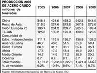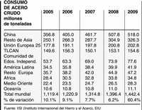 Durante la primera mitad de 2007, la producción de acero crudo creció 10% ante el primer semestre de 2006, con China a la cabeza, con un aumento de 20.4% en comparación con el año anterior. En el resto del mundo el suministro creció 4.7%, a pesar de que la producción de los países del Tratado de Libre Comercio de América del Norte (TLCAN) cayó 5% en el mismo periodo. Parte significativa del excedente de la producción china se exportó. En los primeros seis meses, las exportaciones de acero de ese país aumentaron casi 250% contra el mismo periodo de 2006.