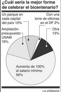 ¿De veras la construcción de una torre de oficinas a orillas de Lomas de Chapultepec -la más alta de América Latina- sería la mejor forma de celebrar el bicentenario de la Independencia, como propone el Gobierno del Distrito Federal? No todos están de acuerdo. En la encuesta que hicimos esta semana entre 7 mil 687 miembros activos de nuestro Foro México, 56 por ciento opinó que sería mejor un aumento de 100 por ciento al salario mínimo, en cambio, sólo 2 por ciento votó por la edificación de la torre. Diecinueve por ciento se pronunció por la ampliación del presupuesto de la UNAM, a fin de que abra las puertas a más jóvenes y disminuya el número de rechazados; 10 por ciento se inclinó por la construcción de un parque en cada capital del país. El restante 13 por ciento hizo otras propuestas.