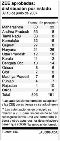 Los esfuerzos de India por emular el más que evidente y exitoso desarrollo de las zonas económicas especiales de China empezaron a generar controversia apenas la legislación entró en vigor, a principios de 2006. La oposición ha ido desde quejas de ministros hasta protestas violentas que obligaron al gobierno, en enero de 2007, a posponer la aprobación de estas compras. Sin embargo, el desarrollo de las ZEE al parecer vuelve a estar en auge. El 22 de junio se aprobaron cerca de 36, con lo cual el número total de zonas autorizadas asciende a 339.
