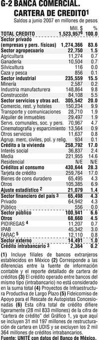A junio de 2007, la cartera total de crédito otorgado por la banca comercial presentó un saldo de 1 billón 524 mil millones de pesos, de los cuales mil 274 billones (83.6%) eran créditos a empresas privadas y personas físicas; 65 mil millones (4.3%) al sector financiero del país; 101 mil millones (6.6%) al sector público; 69 mil millones (4.5%) a otros prestatarios (Pidiregas, IPAB, FARAC), y 15 mil millones (1.0%) al sector externo (Gráfico 2).
