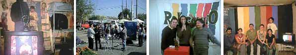 Luego de presentarnos nos trasladamos en “micro” (camión urbano) hasta la Población de La Victoria, un asentamiento que hace cincuenta años fue escenario de la primera toma de tierras para crear una colonia popular. Durante la dictadura militar, los habitantes de La Victoria fueron un bastión de la disidencia, teniendo desde siempre una sólida organización vecinal reflejada ahora en los murales con imágenes de Salvador Allende, el Che Guevara y el Subcomandante Marcos , que decoran la vía principal por la que caminamos. Sobre esa calle, en una amplia bodega, hay un local del Partido Comunista. Seguimos hasta llegar a una casa que resalta de las otras solamente por una enorme antena en su azotea y una cochera donde hay amontonados tablones de madera pintados, que se usan como escenografía en sus transmisiones desde el estudio.